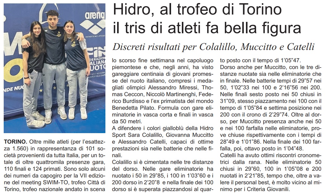 TORINO. Oltre mille atleti (per l’esattezza 1.560) in rappresentanza di 101 società provenienti da tutta Italia, per un totale di oltre quattromila presenze gara, 110 finali e 124 primati. Sono solo alcuni dei numeri da capogiro per la VII edizione del meeting SWIM-TO, trofeo Città di Torino, trofeo nazionale andato in scena 0lo scorso fine settimana nel capoluogo piemontese e che, negli anni, ha visto gareggiare centinaia di giovani promesse del nuoto italiano, compresi i medagliati olimpici Alessandro Miressi, Thomas Ceccon, Niccolò Martinenghi, Federico Burdisso e l’ex primatista del mondo Benedetta Pilato. Formula con gare eliminatorie in vasca corta e finali in vasca da 50 metri. A difendere i colori gialloblù della Hidro Sport Sara Colalillo, Giovanna Muccitto e Alessandro Catelli, capaci di ottime prestazioni sia nelle batterie che nelle finali. Colalillo si è cimentata nelle tre distanze del dorso. Nelle gare eliminatorie ha nuotato i 50 in 29”85, i 100 in 1’03”60 e i 200 dorso in 2’20”8 e nella finale dei 100 dorso si è superata piazzandosi al quarto posto con il tempo di 1’05”47. Dorso anche per Muccitto, con le tre distanze nuotate sia nelle eliminatorie che in finale. Nelle batterie tempi di 29”57 nei 50, 1’02”33 nei 100 e 2’16”56 nei 200. Nelle finali sesto posto nei 50 chiusi in 31”09, stesso piazzamento nei 100 con il tempo di 1’05”84 e settima posizione nei 200 con il crono di 2’29”74. Oltre al dorso, per Muccitto presenza anche nei 50 e nei 100 farfalla nelle eliminatorie, prove chiuse rispettivamente con i tempi di 28”49 e 1’01”86. Nella finale dei 100 farfalla, poi, ottavo posto in 1’04”48. Catelli ha avuto ottimi riscontri cronometrici dalla rana. Nelle eliminatorie 50 chiusi in 29”60, 100 in 1’05”08 e 200 nuotati in 2’21”85, tempo che, oltre a valere il personal best, è molto vicino al minimo per i Criteria Giovanili.