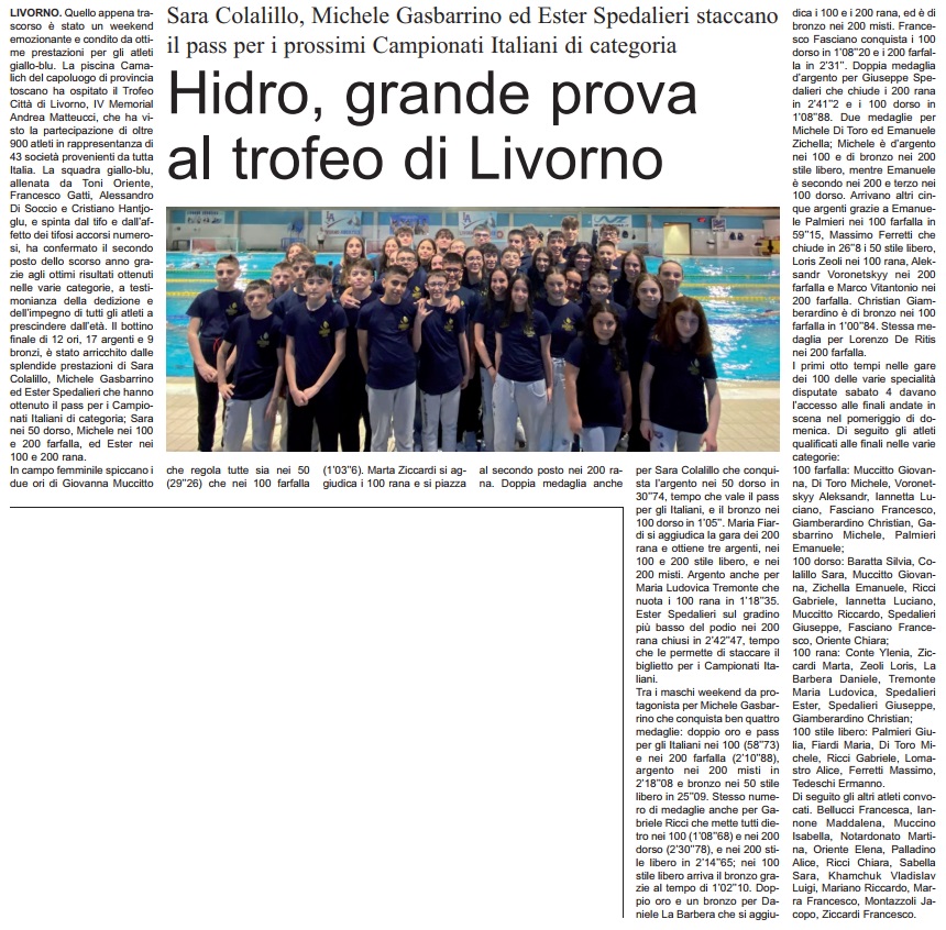 LIVORNO. Quello appena trascorso è stato un weekend emozionante e condito da ottime prestazioni per gli atleti giallo-blu. La piscina Camalich del capoluogo di provincia toscano ha ospitato il Trofeo Città di Livorno, IV Memorial Andrea Matteucci, che ha visto la partecipazione di oltre 900 atleti in rappresentanza di 43 società provenienti da tutta Italia. La squadra giallo-blu, allenata da Toni Oriente, Francesco Gatti, Alessandro Di Soccio e Cristiano Hantjoglu, e spinta dal tifo e dall’affetto dei tifosi accorsi numerosi, ha confermato il secondo posto dello scorso anno grazie agli ottimi risultati ottenuti nelle varie categorie, a testimonianza della dedizione e dell’impegno di tutti gli atleti a prescindere dall’età. Il bottino finale di 12 ori, 17 argenti e 9 bronzi, è stato arricchito dalle splendide prestazioni di Sara Colalillo, Michele Gasbarrino ed Ester Spedalieri che hanno ottenuto il pass per i Campionati Italiani di categoria; Sara nei 50 dorso, Michele nei 100 e 200 farfalla, ed Ester nei 100 e 200 rana. In campo femminile spiccano i due ori di Giovanna Muccitto che regola tutte sia nei 50 (29’’26) che nei 100 farfalla (1’03’’6). Marta Ziccardi si aggiudica i 100 rana e si piazza al secondo posto nei 200 rana. Doppia medaglia anche per Sara Colalillo che conquista l’argento nei 50 dorso in 30’’74, tempo che vale il pass per gli Italiani, e il bronzo nei 100 dorso in 1’05’’. Maria Fiardi si aggiudica la gara dei 200 rana e ottiene tre argenti, nei 100 e 200 stile libero, e nei 200 misti. Argento anche per Maria Ludovica Tremonte che nuota i 100 rana in 1’18’’35. Ester Spedalieri sul gradino più basso del podio nei 200 rana chiusi in 2’42’’47, tempo che le permette di staccare il biglietto per i Campionati Italiani. Tra i maschi weekend da protagonista per Michele Gasbarrino che conquista ben quattro medaglie: doppio oro e pass per gli Italiani nei 100 (58’’73) e nei 200 farfalla (2’10’’88), argento nei 200 misti in 2’18’’08 e bronzo nei 50 stile libero in 25’’09. Stesso numero di medaglie anche per Gabriele Ricci che mette tutti dietro nei 100 (1’08’’68) e nei 200 dorso (2’30’’78), e nei 200 stile libero in 2’14’’65; nei 100 stile libero arriva il bronzo grazie al tempo di 1’02’’10. Doppio oro e un bronzo per Daniele La Barbera che si aggiudica i 100 e i 200 rana, ed è di bronzo nei 200 misti. Francesco Fasciano conquista i 100 dorso in 1’08’’20 e i 200 farfalla in 2’31’’. Doppia medaglia d’argento per Giuseppe Spedalieri che chiude i 200 rana in 2’41’’2 e i 100 dorso in 1’08’’88. Due medaglie per Michele Di Toro ed Emanuele Zichella; Michele è d’argento nei 100 e di bronzo nei 200 stile libero, mentre Emanuele è secondo nei 200 e terzo nei 100 dorso. Arrivano altri cinque argenti grazie a Emanuele Palmieri nei 100 farfalla in 59’’15, Massimo Ferretti che chiude in 26’’8 i 50 stile libero, Loris Zeoli nei 100 rana, Aleksandr Voronetskyy nei 200 farfalla e Marco Vitantonio nei 200 farfalla. Christian Giamberardino è di bronzo nei 100 farfalla in 1’00’’84. Stessa medaglia per Lorenzo De Ritis nei 200 farfalla. I primi otto tempi nelle gare dei 100 delle varie specialità disputate sabato 4 davano l’accesso alle finali andate in scena nel pomeriggio di domenica. Di seguito gli atleti qualificati alle finali nelle varie categorie: 100 farfalla: Muccitto Giovanna, Di Toro Michele, Voronetskyy Aleksandr, Iannetta Luciano, Fasciano Francesco, Giamberardino Christian, Gasbarrino Michele, Palmieri Emanuele; 100 dorso: Baratta Silvia, Colalillo Sara, Muccitto Giovanna, Zichella Emanuele, Ricci Gabriele, Iannetta Luciano, Muccitto Riccardo, Spedalieri Giuseppe, Fasciano Francesco, Oriente Chiara; 100 rana: Conte Ylenia, Ziccardi Marta, Zeoli Loris, La Barbera Daniele, Tremonte Maria Ludovica, Spedalieri Ester, Spedalieri Giuseppe, Giamberardino Christian; 100 stile libero: Palmieri Giulia, Fiardi Maria, Di Toro Michele, Ricci Gabriele, Lomastro Alice, Ferretti Massimo, Tedeschi Ermanno. Di seguito gli altri atleti convocati. Bellucci Francesca, Iannone Maddalena, Muccino Isabella, Notardonato Martina, Oriente Elena, Palladino Alice, Ricci Chiara, Sabella Sara, Khamchuk Vladislav Luigi, Mariano Riccardo, Marra Francesco, Montazzoli Jacopo, Ziccardi Francesco.