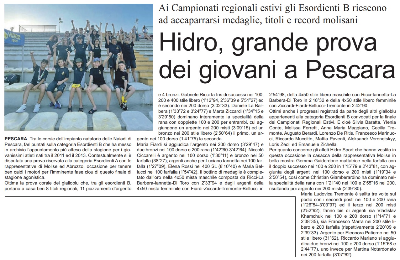 PESCARA. Tra le corsie dell’impianto natatorio delle Naiadi di Pescara, fari puntati sulla categoria Esordienti B che ha messo in archivio l’appuntamento più atteso della stagione per i giovanissimi atleti nati tra il 2011 ed il 2013. Contestualmente si è disputata una prova riservata alla categoria Esordienti A con le rappresentative di Molise ed Abruzzo, occasione per tenere ben caldi i motori per l’imminente fase clou di questo finale di stagione agonistica. Ottima la prova corale dei gialloblu che, tra gli esordienti B, portano a casa ben 8 titoli regionali, 11 piazzamenti d’argento e 4 bronzi: Gabriele Ricci fa tris di successi nei 100, 200 e 400 stile libero (1’12”94, 2’36”39 e 5’51”27) ed è secondo nei 200 dorso (3’02”33). Daniele La Barbera (1’33”72 e 3’24”77) e Marta Ziccardi (1’34”15 e 3’29”50) dominano interamente la specialità della rana con doppiette 100 e 200 per entrambi, cui aggiungono un argento nei 200 misti (3’09”15) ed un bronzo nei 200 stile libero (2’50”64) il primo, un argento nei 100 dorso (1’41”75) la seconda. Maria Fiardi si aggiudica l’argento nei 200 dorso (3’29”47) e due bronzi nei 100 dorso e 200 rana (1’42”60-3’42”64). Niccolò Ciccarelli è argento nei 100 dorso (1’30”11) e bronzo nei 50 farfalla (38”27); argenti anche per Luciano Iannetta nei 100 farfalla (1’27”09), Elena Rossi nei 400 SL (8’10”40) e Maria Bellucci nei 100 farfalla (1’54”42). Il bottino di medaglie è completato dall’oro nella 4x50 mista maschile composta da Ricci-La Barbera-Iannetta-Di Toro con 2’33”94 e dagli argenti della 4x50 mista femminile con Fiardi-Ziccardi-Tremonte-Bellucci in 2’54”98, della 4x50 stile libero maschile con Ricci-Iannetta-La Barbera-Di Toro in 2’18”32 e della 4x50 stile libero femminile con Ziccardi-Fiardi-Bellucci-Tremonte in 2’42”90. Ottimi anche i progressi registrati da parte degli altri gialloblu appartenenti alla categoria Esordienti B convocati per la finale dei Campionati Regionali Estivi. E cioè Silvia Baratta, Ylenia Conte, Melissa Ferretti, Anna Maria Maggiano, Cecilia Tremonte, Augusto Berardi, Lorenzo De Ritis, Francesco Marinucci, Riccardo Muccitto, Mattia Paventi, Aleksandr Voronetskyy, Loris Zeoli ed Emanuele Zichella. Per quanto concerne gli atleti Hidro Sport che hanno vestito in questa occasione la casacca della rappresentativa Molise in bella mostra Gemma Guiderdone mattatrice nella farfalla con il doppio successo nei 100 e 200 in 1’15”79 e 2’43”81, con aggiunta degli argenti nei 100 dorso e 200 misti (1’19”34 e 2’50”54), così come Christian Giamberardino ha dominato nella specialità della rana con 1’21”40 nei 100 e 2’55”16 nei 200, risultando poi argento nei 200 misti (2’39”80). Maria Ludovica Tremonte è salita tre volte sul podio con i secondi posti nei 100 e 200 rana (1’26”54-3’03”97) ed il terzo nei 200 misti (2’52”92); fanno bis di argenti sia Vladislav Khamchuk nei 100 e 200 dorso (1’14”71 e 2’38”35), sia Francesco Marra nei 200 stile libero e 200 farfalla (rispettivamente 2’20”09 e 2’39”33). Argento per Eleonora Patierno nei 50 stile libero (31”62). Riccardo Mariano si aggiudica due bronzi nei 100 e 200 dorso (1’15”68 e 2’44”77), uno invece per Martina Notardonato nei 200 farfalla (3’07”62).