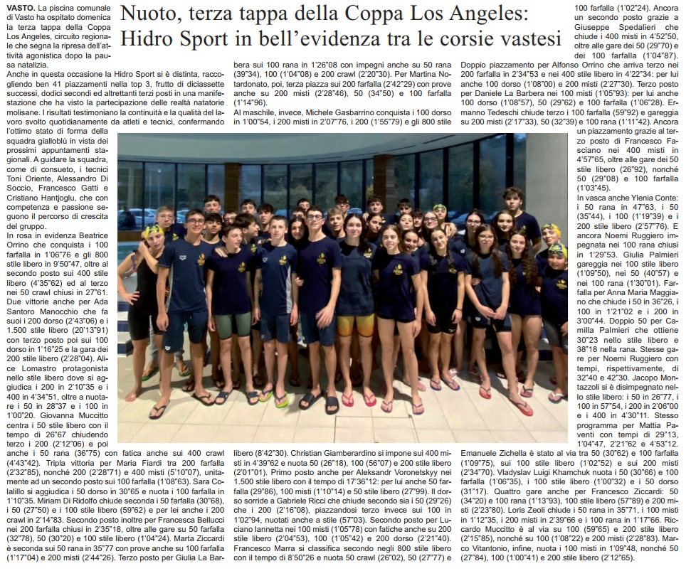 VASTO. La piscina comunale di Vasto ha ospitato domenica la terza tappa della Coppa Los Angeles, circuito regionale che segna la ripresa dell’attività agonistica dopo la pausa natalizia. Anche in questa occasione la Hidro Sport si è distinta, raccogliendo ben 41 piazzamenti nella top 3, frutto di diciassette successi, dodici secondi ed altrettanti terzi posti in una manifestazione che ha visto la partecipazione delle realtà natatorie molisane. I risultati testimoniano la continuità e la qualità del lavoro svolto quotidianamente da atleti e tecnici, confermando l’ottimo stato di forma della squadra gialloblù in vista dei prossimi appuntamenti stagionali. A guidare la squadra, come di consueto, i tecnici Toni Oriente, Alessandro Di Soccio, Francesco Gatti e Cristiano Hantjoglu, che con competenza e passione seguono il percorso di crescita del gruppo. In rosa in evidenza Beatrice Orrino che conquista i 100 farfalla in 1’06”76 e gli 800 stile libero in 9’50”47, oltre al secondo posto sui 400 stile libero (4’35”62) ed al terzo nei 50 crawl chiusi in 27”61. Due vittorie anche per Ada Santoro Manocchio che fa suoi i 200 dorso (2’43”06) e i 1.500 stile libero (20’13”91) con terzo posto poi sui 100 dorso in 1’16”25 e la gara dei 200 stile libero (2’28”04). Alice Lomastro protagonista nello stile libero dove si aggiudica i 200 in 2’10”35 e i 400 in 4’34”51, oltre a nuotare i 50 in 28”37 e i 100 in 1’00”20. Giovanna Muccitto centra i 50 stile libero con il tempo di 26”67 chiudendo terzo i 200 (2’12”06) e poi anche i 50 rana (36”75) con fatica anche sui 400 crawl (4’43”42). Tripla vittoria per Maria Fiardi tra 200 farfalla (2’32”85), nonché 200 (2’28”71) e 400 misti (5’10”07), unitamente ad un secondo posto sui 100 farfalla (1’08”63). Sara Colalillo si aggiudica i 50 dorso in 30”65 e nuota i 100 farfalla in 1’10”35. Miriam Di Ridolfo chiude seconda i 50 farfalla (30”68), i 50 (27”50) e i 100 stile libero (59”62) e per lei anche i 200 crawl in 2’14”83. Secondo posto inoltre per Francesca Bellucci nei 200 farfalla chiusi in 2’35”18, oltre alle gare su 50 farfalla (32”78), 50 (30”20) e 100 stile libero (1’04”24). Marta Ziccardi è seconda sui 50 rana in 35”77 con prove anche su 100 farfalla (1’17”04) e 200 misti (2’44”26). Terzo posto per Giulia La Barbera sui 100 rana in 1’26”08 con impegni anche su 50 rana (39”34), 100 (1’04”08) e 200 crawl (2’20”30). Per Martina Notardonato, poi, terza piazza sui 200 farfalla (2’42”29) con prove anche su 200 misti (2’28”46), 50 (34”50) e 100 farfalla (1’14”96). Al maschile, invece, Michele Gasbarrino conquista i 100 dorso in 1’00”54, i 200 misti in 2’07”76, i 200 (1’55”79) e gli 800 stile libero (8’42”30). Christian Giamberardino si impone sui 400 misti in 4’39”62 e nuota 50 (26”18), 100 (56”07) e 200 stile libero (2’01”01). Primo posto anche per Aleksandr Voronetskyy nei 1.500 stile libero con il tempo di 17’36”12: per lui anche 50 farfalla (29”86), 100 misti (1’10”14) e 50 stile libero (27”99). Il dorso sorride a Gabriele Ricci che chiude secondo sia i 50 (29”26) che i 200 (2’16”08), piazzandosi terzo invece sui 100 in 1’02”94, nuotati anche a stile (57”03). Secondo posto per Luciano Iannetta nei 100 misti (1’05”78) con fatiche anche su 200 stile libero (2’04”53), 100 (1’05”42) e 200 dorso (2’21”40). Francesco Marra si classifica secondo negli 800 stile libero con il tempo di 8’50”26 e nuota 50 crawl (26”02), 50 (27”77) e 100 farfalla (1’02”24). Ancora un secondo posto grazie a Giuseppe Spedalieri che chiude i 400 misti in 4’52”50, oltre alle gare dei 50 (29”70) e dei 100 farfalla (1’04”87). Doppio piazzamento per Alfonso Orrino che arriva terzo nei 200 farfalla in 2’34”53 e nei 400 stile libero in 4’22”34: per lui anche 100 dorso (1’08”00) e 200 misti (2’27”30). Terzo posto per Daniele La Barbera nei 100 misti (1’05”93): per lui anche 100 dorso (1’08”57), 50 (29”62) e 100 farfalla (1’06”28). Ermanno Tedeschi chiude terzo i 100 farfalla (59”92) e gareggia su 200 misti (2’17”33), 50 (32”39) e 100 rana (1’11”42). Ancora un piazzamento grazie al terzo posto di Francesco Fasciano nei 400 misti in 4’57”65, oltre alle gare dei 50 stile libero (26”92), nonché 50 (29”08) e 100 farfalla (1’03”45). In vasca anche Ylenia Conte: i 50 rana in 47”63, i 50 (35”44), i 100 (1’19”39) e i 200 stile libero (2’57”76). E ancora Noemi Ruggiero impegnata nei 100 rana chiusi in 1’29”53. Giulia Palmieri gareggia nei 100 stile libero (1’09”50), nei 50 (40”57) e nei 100 rana (1’30”01). Farfalla per Anna Maria Maggiano che chiude i 50 in 36”26, i 100 in 1’21”02 e i 200 in 3’00”44. Doppio 50 per Camilla Palmieri che ottiene 30”23 nello stile libero e 38”18 nella rana. Stesse gare per Noemi Ruggiero con tempi, rispettivamente, di 32”40 e 42”30. Jacopo Montazzoli si è disimpegnato nello stile libero: i 50 in 26”77, i 100 in 57”54, i 200 in 2’06”00 e i 400 in 4’30”11. Stesso programma per Mattia Paventi con tempi di 29”13, 1’04”47, 2’21”62 e 4’53”12. Emanuele Zichella è stato al via tra 50 (30”62) e 100 farfalla (1’09”75), sui 100 stile libero (1’02”52) e sui 200 misti (2’34”70). Vladyslav Luigi Khamchuk nuota i 50 (30”66) e 100 farfalla (1’06”35), i 100 stile libero (1’00”32) e i 50 dorso (31”17). Quattro gare anche per Francesco Ziccardi: 50 (34”20) e 100 rana (1’13”93), 100 stile libero (57”89) e 200 misti (2’23”80). Loris Zeoli chiude i 50 rana in 35”71, i 100 misti in 1’12”35, i 200 misti in 2’39”66 e i 100 rana in 1’17”66. Riccardo Muccitto è al via su 100 (59”65) e 200 stile libero (2’15”85), nonché su 100 (1’08”22) e 200 misti (2’28”83). Marco Vitantonio, infine,
