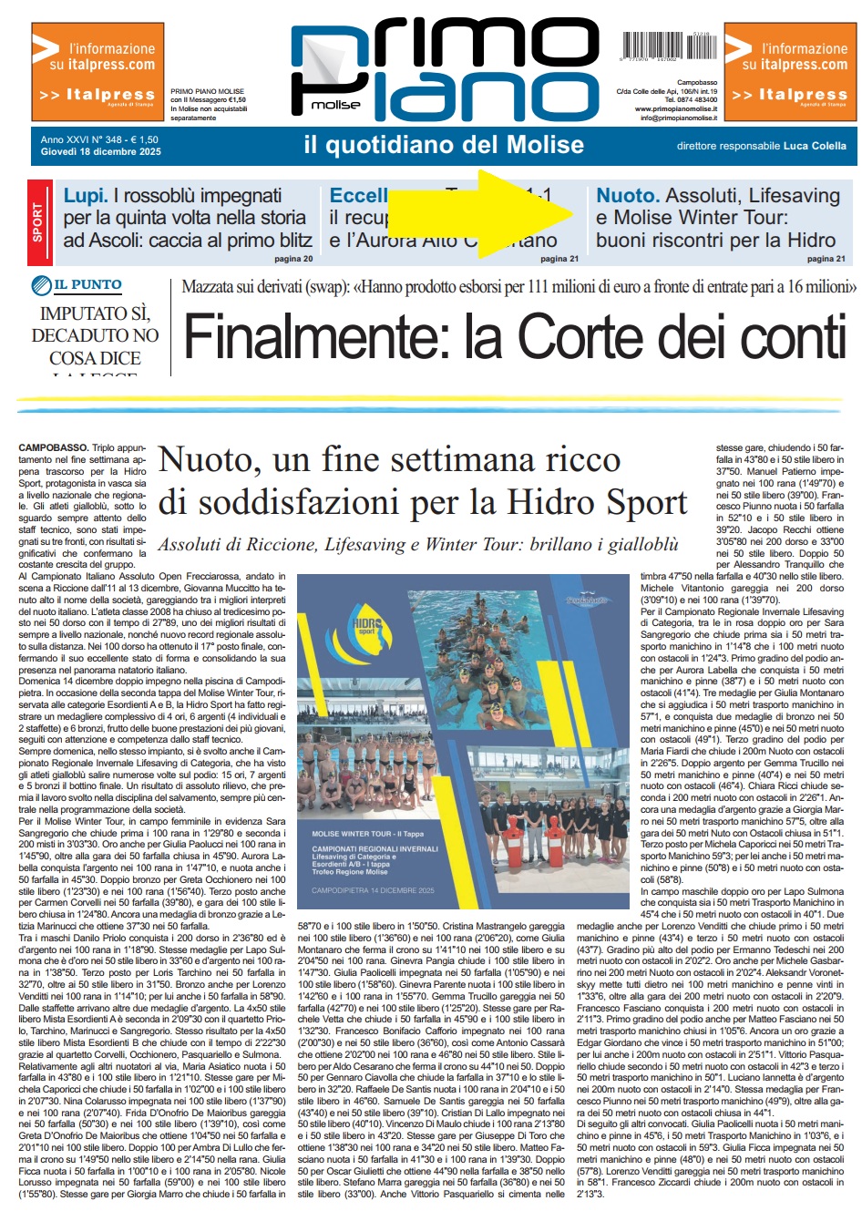 CAMPOBASSO. Triplo appuntamento nel fine settimana appena trascorso per la Hidro Sport, protagonista in vasca sia a livello nazionale che regionale. Gli atleti gialloblù, sotto lo sguardo sempre attento dello staff tecnico, sono stati impegnati su tre fronti, con risultati significativi che confermano la costante crescita del gruppo. Al Campionato Italiano Assoluto Open Frecciarossa, andato in scena a Riccione dall’11 al 13 dicembre, Giovanna Muccitto ha tenuto alto il nome della società, gareggiando tra i migliori interpreti del nuoto italiano. L’atleta classe 2008 ha chiuso al tredicesimo posto nei 50 dorso con il tempo di 27”89, uno dei migliori risultati di sempre a livello nazionale, nonché nuovo record regionale assoluto sulla distanza. Nei 100 dorso ha ottenuto il 17° posto finale, confermando il suo eccellente stato di forma e consolidando la sua presenza nel panorama natatorio italiano. Domenica 14 dicembre doppio impegno nella piscina di Campodipietra. In occasione della seconda tappa del Molise Winter Tour, riservata alle categorie Esordienti A e B, la Hidro Sport ha fatto registrare un medagliere complessivo di 4 ori, 6 argenti (4 individuali e 2 staffette) e 6 bronzi, frutto delle buone prestazioni dei più giovani, seguiti con attenzione e competenza dallo staff tecnico. Sempre domenica, nello stesso impianto, si è svolto anche il Campionato Regionale Invernale Lifesaving di Categoria, che ha visto gli atleti gialloblù salire numerose volte sul podio: 15 ori, 7 argenti e 5 bronzi il bottino finale. Un risultato di assoluto rilievo, che premia il lavoro svolto nella disciplina del salvamento, sempre più centrale nella programmazione della società. Per il Molise Winter Tour, in campo femminile in evidenza Sara Sangregorio che chiude prima i 100 rana in 1’29”80 e seconda i 200 misti in 3’03”30. Oro anche per Giulia Paolucci nei 100 rana in 1’45”90, oltre alla gara dei 50 farfalla chiusa in 45”90. Aurora Labella conquista l’argento nei 100 rana in 1’47”10, e nuota anche i 50 farfalla in 45”30. Doppio bronzo per Greta Occhionero nei 100 stile libero (1’23”30) e nei 100 rana (1’56”40). Terzo posto anche per Carmen Corvelli nei 50 farfalla (39”80), e gara dei 100 stile libero chiusa in 1’24”80. Ancora una medaglia di bronzo grazie a Letizia Marinucci che ottiene 37”30 nei 50 farfalla. Tra i maschi Danilo Priolo conquista i 200 dorso in 2’36”80 ed è d’argento nei 100 rana in 1’18”90. Stesse medaglie per Lapo Sulmona che è d’oro nei 50 stile libero in 33”60 e d’argento nei 100 rana in 1’38”50. Terzo posto per Loris Tarchino nei 50 farfalla in 32”70, oltre ai 50 stile libero in 31”50. Bronzo anche per Lorenzo Venditti nei 100 rana in 1’14”10; per lui anche i 50 farfalla in 58”90. Dalle staffette arrivano altre due medaglie d’argento. La 4x50 stile libero Mista Esordienti A è seconda in 2’09”30 con il quartetto Priolo, Tarchino, Marinucci e Sangregorio. Stesso risultato per la 4x50 stile libero Mista Esordienti B che chiude con il tempo di 2’22”30 grazie al quartetto Corvelli, Occhionero, Pasquariello e Sulmona. Relativamente agli altri nuotatori al via, Maria Asiatico nuota i 50 farfalla in 43”80 e i 100 stile libero in 1’21”10. Stesse gare per Michela Caporicci che chiude i 50 farfalla in 1’02”00 e i 100 stile libero in 2’07”30. Nina Colarusso impegnata nei 100 stile libero (1’37”90) e nei 100 rana (2’07”40). Frida D’Onofrio De Maioribus gareggia nei 50 farfalla (50”30) e nei 100 stile libero (1’39”10), così come Greta D’Onofrio De Maioribus che ottiene 1’04”50 nei 50 farfalla e 2’01”10 nei 100 stile libero. Doppio 100 per Ambra Di Lullo che ferma il crono su 1’49”50 nello stile libero e 2’14”50 nella rana. Giulia Ficca nuota i 50 farfalla in 1’00”10 e i 100 rana in 2’05”80. Nicole Lorusso impegnata nei 50 farfalla (59”00) e nei 100 stile libero (1’55”80). Stesse gare per Giorgia Marro che chiude i 50 farfalla in 58”70 e i 100 stile libero in 1’50”50. Cristina Mastrangelo gareggia nei 100 stile libero (1’36”60) e nei 100 rana (2’06”20), come Giulia Montanaro che ferma il crono su 1’41”10 nei 100 stile libero e su 2’04”50 nei 100 rana. Ginevra Pangia chiude i 100 stile libero in 1’47”30. Giulia Paolicelli impegnata nei 50 farfalla (1’05”90) e nei 100 stile libero (1’58”60). Ginevra Parente nuota i 100 stile libero in 1’42”60 e i 100 rana in 1’55”70. Gemma Trucillo gareggia nei 50 farfalla (42”70) e nei 100 stile libero (1’25”20). Stesse gare per Rachele Vetta che chiude i 50 farfalla in 45”90 e i 100 stile libero in 1’32”30. Francesco Bonifacio Cafforio impegnato nei 100 rana (2’00”30) e nei 50 stile libero (36”60), così come Antonio Cassarà che ottiene 2’02”00 nei 100 rana e 46”80 nei 50 stile libero. Stile libero per Aldo Cesarano che ferma il crono su 44”10 nei 50. Doppio 50 per Gennaro Ciavolla che chiude la farfalla in 37”10 e lo stile libero in 32”20. Raffaele De Santis nuota i 100 rana in 2’04”10 e i 50 stile libero in 46”60. Samuele De Santis gareggia nei 50 farfalla (43”40) e nei 50 stile libero (39”10). Cristian Di Lallo impegnato nei 50 stile libero (40”10). Vincenzo Di Maulo chiude i 100 rana 2’13”80 e i 50 stile libero in 43”20. Stesse gare per Giuseppe Di Toro che ottiene 1’38”30 nei 100 rana e 34”20 nei 50 stile libero. Matteo Fasciano nuota i 50 farfalla in 41”30 e i 100 rana in 1’39”30. Doppio 50 per Oscar Giulietti che ottiene 44”90 nella farfalla e 38”50 nello stile libero. Stefano Marra gareggia nei 50 farfalla (36”80) e nei 50 stile libero (33”00). Anche Vittorio Pasquariello si cimenta nelle stesse gare, chiudendo i 50 farfalla in 43”80 e i 50 stile libero in 37”50. Manuel Patierno impegnato nei 100 rana (1’49”70) e nei 50 stile libero (39”00). Francesco Piunno nuota i 50 farfalla in 52