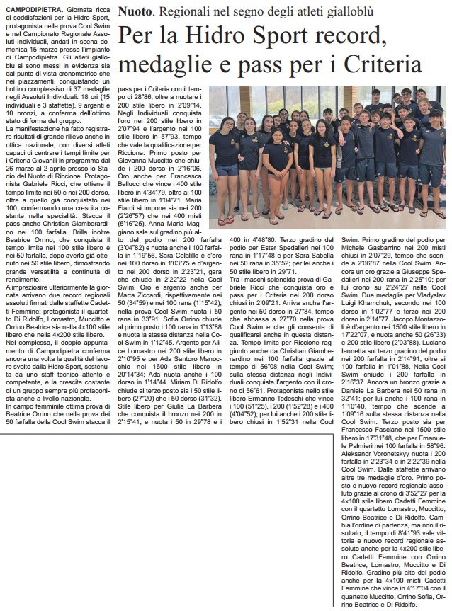 CAMPODIPIETRA. Giornata ricca di soddisfazioni per la Hidro Sport, protagonista nella prova Cool Swim e nel Campionato Regionale Assoluti Individuali, andati in scena domenica 15 marzo presso l’impianto di Campodipietra. Gli atleti gialloblu si sono messi in evidenza sia dal punto di vista cronometrico che nei piazzamenti, conquistando un bottino complessivo di 37 medaglie negli Assoluti Individuali: 18 ori (15 individuali e 3 staffette), 9 argenti e 10 bronzi, a conferma dell’ottimo stato di forma del gruppo. La manifestazione ha fatto registrare risultati di grande rilievo anche in ottica nazionale, con diversi atleti capaci di centrare i tempi limite per i Criteria Giovanili in programma dal 26 marzo al 2 aprile presso lo Stadio del Nuoto di Riccione. Protagonista Gabriele Ricci, che ottiene il tempo limite nei 50 e nei 200 dorso, oltre a quello già conquistato nei 100, confermando una crescita costante nella specialità. Stacca il pass anche Christian Giamberardino nei 100 farfalla. Brilla inoltre Beatrice Orrino, che conquista il tempo limite nei 100 stile libero e nei 50 farfalla, dopo averlo già ottenuto nei 50 stile libero, dimostrando grande versatilità e continuità di rendimento. A impreziosire ulteriormente la giornata arrivano due record regionali assoluti firmati dalle staffette Cadetti Femmine; protagonista il quartetto Di Ridolfo, Lomastro, Muccitto e Orrino Beatrice sia nella 4x100 stile libero che nella 4x200 stile libero. Nel complesso, il doppio appuntamento di Campodipietra conferma ancora una volta la qualità del lavoro svolto dalla Hidro Sport, sostenuta da uno staff tecnico attento e competente, e la crescita costante di un gruppo sempre più protagonista anche a livello nazionale. In campo femminile ottima prova di Beatrice Orrino che nella prova dei 50 farfalla della Cool Swim stacca il pass per i Criteria con il tempo di 28”86, oltre a nuotare i 200 stile libero in 2’09”14. Negli Individuali conquista l’oro nei 200 stile libero in 2’07”94 e l’argento nei 100 stile libero in 57”93, tempo che vale la qualificazione per Riccione. Primo posto per Giovanna Muccitto che chiude i 200 dorso in 2’16”06. Oro anche per Francesca Bellucci che vince i 400 stile libero in 4’34”79, oltre ai 100 stile libero in 1’04”71. Maria Fiardi si impone sia nei 200 (2’26”57) che nei 400 misti (5’16”25). Anna Maria Maggiano sale sul gradino più alto del podio nei 200 farfalla (3’04”82) e nuota anche i 100 farfalla in 1’19”56. Sara Colalillo è d’oro nei 100 dorso in 1’03”75 e d’argento nei 200 dorso in 2’23”21, gara che chiude in 2’22”22 nella Cool Swim. Oro e argento anche per Marta Ziccardi, rispettivamente nei 50 (34”59) e nei 100 rana (1’15”42); nella prova Cool Swim nuota i 50 rana in 33”91. Sofia Orrino chiude al primo posto i 100 rana in 1’13”88 e nuota la stessa distanza nella Cool Swim in 1’12”45. Argento per Alice Lomastro nei 200 stile libero in 2’10”95 e per Ada Santoro Manocchio nei 1500 stile libero in 20’14”34; Ada nuota anche i 100 dorso in 1’14”44. Miriam Di Ridolfo chiude al terzo posto sia i 50 stile libero (27”20) che i 50 dorso (31”32). Stile libero per Giulia La Barbera che conquista il bronzo nei 200 in 2’15”41, e nuota i 50 in 29”78 e i 400 in 4’48”80. Terzo gradino del podio per Ester Spedalieri nei 100 rana in 1’17”48 e per Sara Sabella nei 50 rana in 35”52; per lei anche i 50 stile libero in 29”71. Tra i maschi splendida prova di Gabriele Ricci che conquista oro e pass per i Criteria nei 200 dorso chiusi in 2’09”21. Arriva anche l’argento nei 50 dorso in 27”84, tempo che abbassa a 27”70 nella prova Cool Swim e che gli consente di qualificarsi anche in questa distanza. Tempo limite per Riccione raggiunto anche da Christian Giamberardino nei 100 farfalla grazie al tempo di 56”08 nella Cool Swim; sulla stessa distanza negli Individuali conquista l’argento con il crono di 56”61. Protagonista nello stile libero Ermanno Tedeschi che vince i 100 (51”25), i 200 (1’52”28) e i 400 (4’04”52); per lui anche i 200 stile libero chiusi in 1’52”31 nella Cool Swim. Primo gradino del podio per Michele Gasbarrino nei 200 misti chiusi in 2’07”29, tempo che scende a 2’06”87 nella Cool Swim. Ancora un oro grazie a Giuseppe Spedalieri nei 200 rana in 2’25”10; per lui crono su 2’24”27 nella Cool Swim. Due medaglie per Vladyslav Luigi Khamchuk, secondo nei 100 dorso in 1’02”77 e terzo nei 200 dorso in 2’14”77. Jacopo Montazzoli è d’argento nei 1500 stile libero in 17’22”07, e nuota anche 50 (26”33) e 200 stile libero (2’03”88). Luciano Iannetta sul terzo gradino del podio nei 200 farfalla in 2’14”91, oltre ai 100 farfalla in 1’01”88. Nella Cool Swim chiude i 200 farfalla in 2’16”37. Ancora un bronzo grazie a Daniele La Barbera nei 50 rana in 32”41; per lui anche i 100 rana in 1’10”40, tempo che scende a 1’09”16 sulla stessa distanza nella Cool Swim. Terzo posto sia per Francesco Fasciano nei 1500 stile libero in 17’31”48, che per Emanuele Palmieri nei 100 farfalla in 58”96. Aleksandr Voronetskyy nuota i 200 farfalla in 2’23”34 e in 2’22”39 nella Cool Swim. Dalle staffette arrivano altre tre medaglie d’oro. Primo posto e nuovo record regionale assoluto grazie al crono di 3’52”27 per la 4x100 stile libero Cadetti Femmine con il quartetto Lomastro, Muccitto, Orrino Beatrice e Di Ridolfo. Cambia l’ordine di partenza, ma non il risultato; il tempo di 8’41”93 vale vittoria e nuovo record regionale assoluto anche per la 4x200 stile libero Cadetti Femmine con Orrino Beatrice, Lomastro, Muccitto e Di Ridolfo. Gradino più alto del podio anche per la 4x100 misti Cadetti Femmine che vince in 4’17”04 con il quartetto Muccitto, Orrino Sofia, Orrino Beatrice e Di Ridolfo.